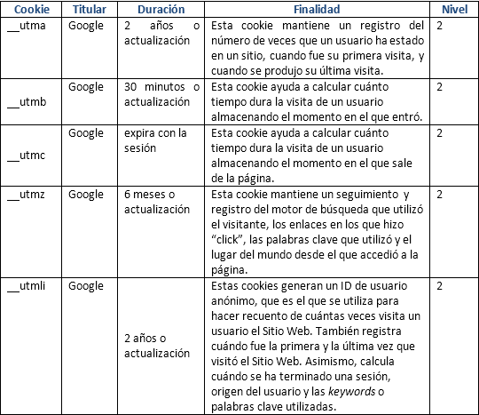 Google Analytics utiliza cookies para ayudarnos a analizar el uso que hacen los usuarios del sitio. La información que genera la cookie acerca de tu uso del sitio (incluyendo tu dirección IP) será directamente transmitida y archivada por Google en sus servidores de Estados Unidos. Google usará esta información por cuenta nuestra con el propósito de seguir la pista de tu uso del sitio, recopilando informes de la actividad del sitio y prestando otros servicios relacionados con la actividad del sitio y el uso de Internet. Google podrá transmitir dicha información a terceros cuando así se lo requiera la legislación, o cuando dichos terceros procesen la información por cuenta de Google. Google no asociará tu dirección IP con ningún otro dato del que disponga Google.